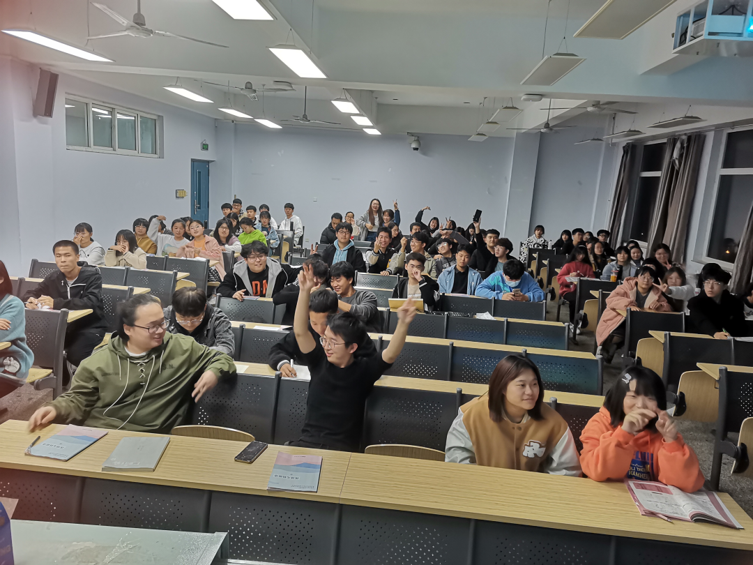 环节二:进行了时下也是韩国综艺必不可少的你划我猜游戏,两位同学配合,一位同学比划不说话,另外一位同学猜测正确答案,规定时间内猜对多者获胜。游戏过程中,同学们的滑稽表演逗笑了大家,也提升了同学之间的默契程度,增进了友谊。