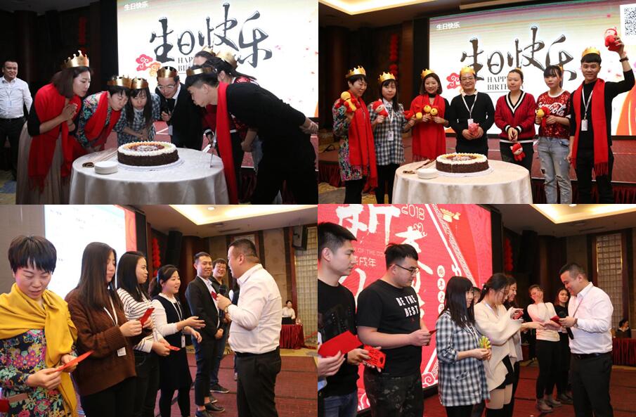 最后在用餐过程中,大家举杯欢唱,开怀畅饮,在晚宴进行了一半的时候,灯光突然暗了下来,大屏幕上突然出现了生日快乐几个字。这时由办公室人员推着生日蛋糕唱着生日快乐歌,缓缓地走向宴会厅的中间向过生日的几位同事送去了惊喜和祝福,邵总亲自上台为过生日的同事切蛋糕,现场气氛异常热烈。联欢会在大合唱相亲相爱一家人中圆满结束。