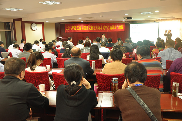 2015年度工业和信息化部教育与考试中心(以下简称教育考试中心)培训工作会议于4月1日在武汉召开,教育考试中心主任徐玉彬、主任助理兼培训办公室主任盛晨媛参加了会议,会议由盛晨媛主持。来自全国各省电子教育中心、全国信息技术水平考试机构、职业教育项目组、专业技能培训项目组和全国信息技术人才培训基地的近80位代表参加会议。